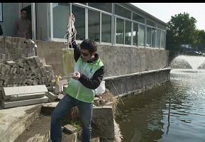 志愿者隨后來(lái)到了西長(zhǎng)涇水質(zhì)提升現(xiàn)場(chǎng),對(duì)現(xiàn)場(chǎng)水域進(jìn)行采樣并使用快速檢測(cè)試紙檢測(cè)