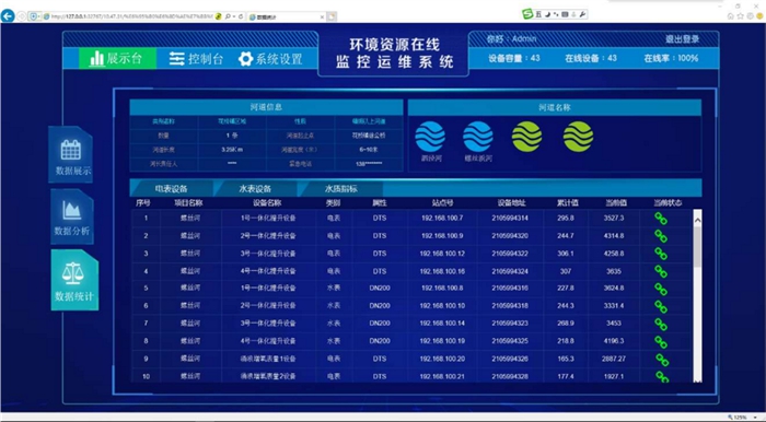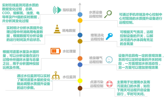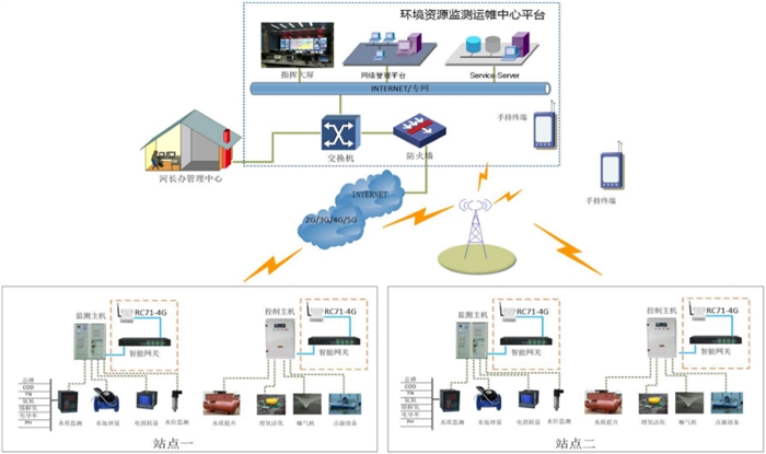 根據現場環境及設備技術要求,主要監控對象包括二部分:一是河體水質環境檢測,二是處理設備運行狀態遠程監控。河體水體環境檢測主要包含河體的地理基礎信息、水位監測、水體水質監測等;處理設備運行狀態遠程監控主要包含設備的運行狀態、遠程控制、視頻圖像監控、設備耗能分析等。實現 24×365 的監控和管理,達到遠程無人值守。充分利用現有資源,保障環境及設備安全運行,以實現最高的可運行效率,不斷提高運營管理水平。