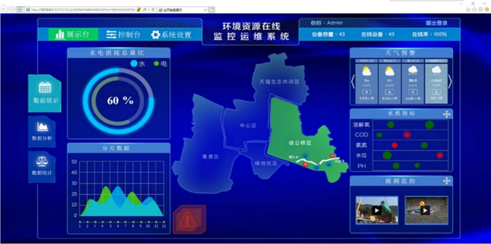 系統軟件主界面主要分為七個部分,分別為地圖導航預覽、總水處理量及電消耗量、分月水處理量及電消耗量、天氣預警、指標告警、視頻監測及設備報警等功能。