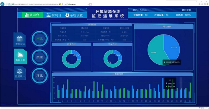 系統可以對河道的的歷史數據與當前或當月數據進行數據對比與分析,分析種為同比、類比與環比分析,可選擇不同時間段,也可以對設備的種類及指標的類別進行不同期的數據對比分析,形成河道水質變化過程的基礎數據,為管理與決策提供依據。