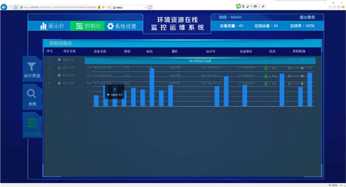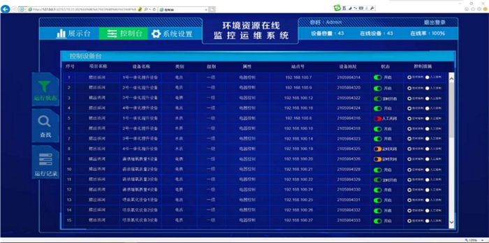 對現場工藝設備進行遠程控制,控制方式為人工控制與自動控制,人工控制主要是由技術員根據河道水質進行人為控制設備的啟停,自動控制是根據預設的時間進行自動啟停設備,系統狀態可以直觀的了解設備的當前狀態:人工關閉、人工啟用、自動關閉與自動開啟。